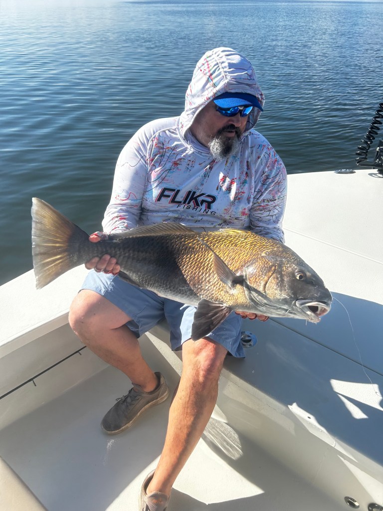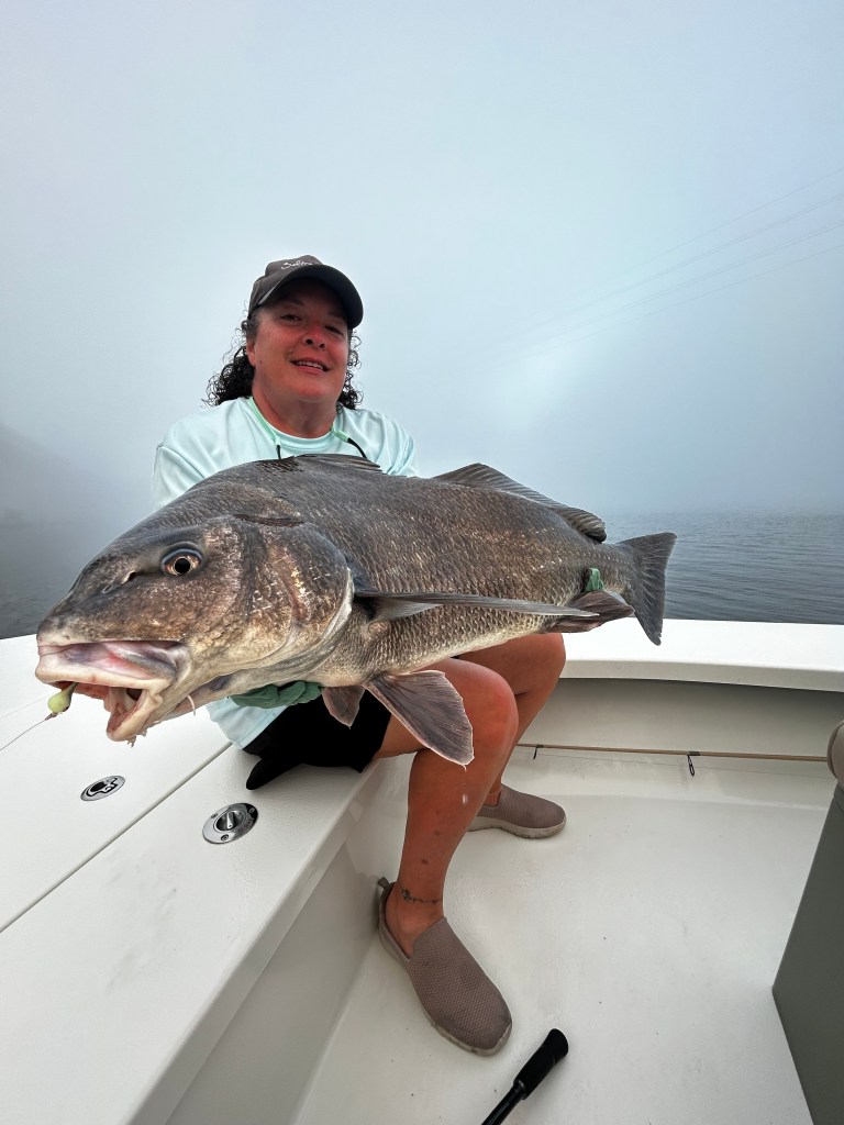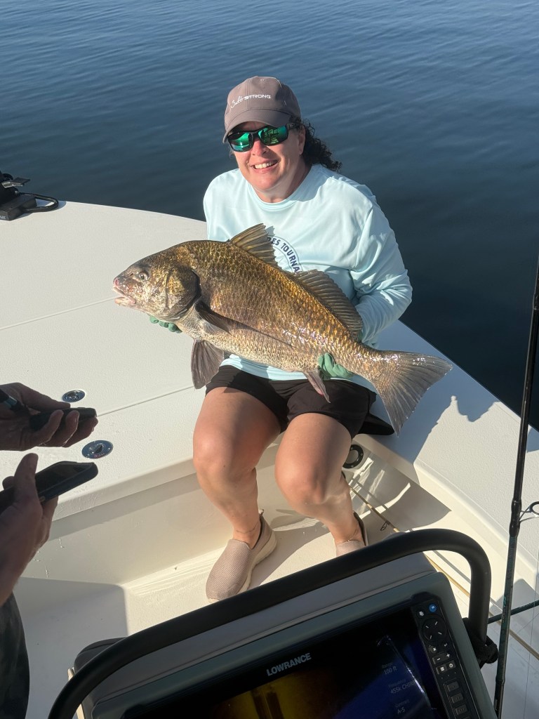 The day’s highlight was Tania’s fierce struggle with a massive black drum. She fought it for about 10 minutes, bringing it alongside the boat three times before it made one last dash. She was worn out, and when it shot under the boat, she couldn’t drop her rod quickly enough, unfortunately, it broke her off. The heartbreak was real, but that’s fishing!