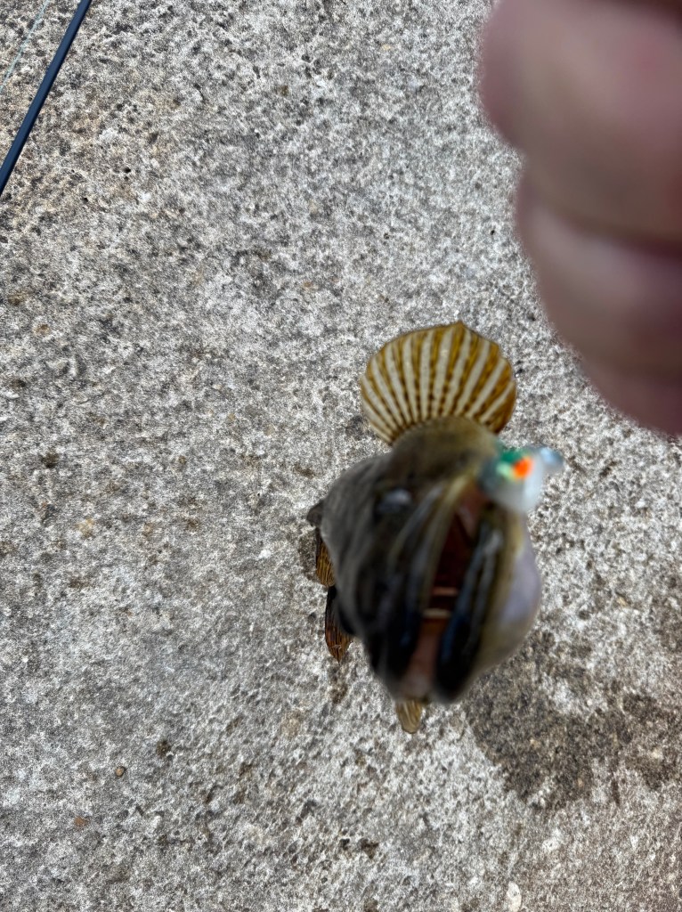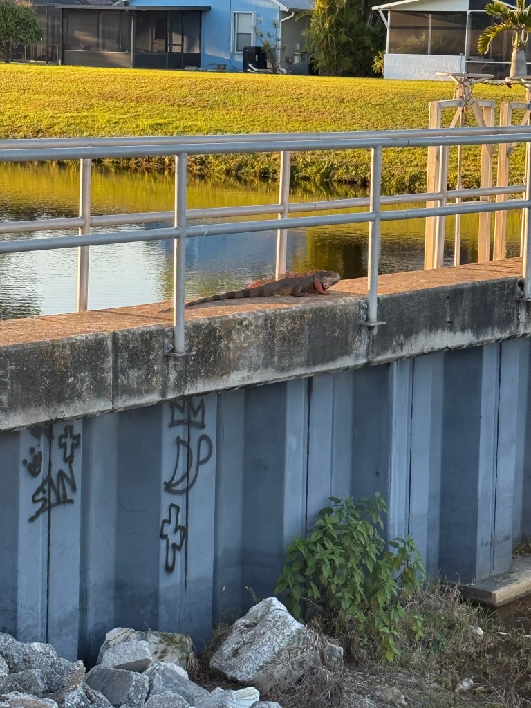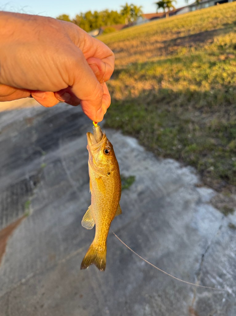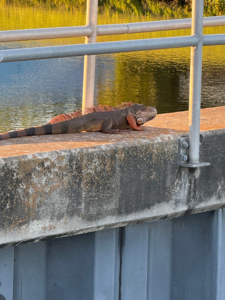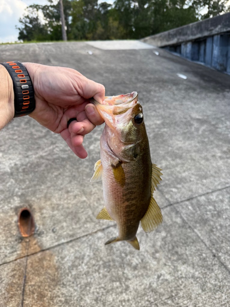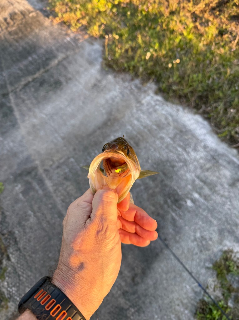When I arrived at my third spot, I was greeted by an unexpected sight—a 5 1/2-foot iguana basking in the sun atop the spillway. It was so relaxed that it had its eyes closed, completely unbothered by my presence. As I made my way down to the water, it gave me a cautious glance but soon realized I was only there to fish. It relaxed again, and I got to work. Within ten minutes, I had landed around seven fish, mostly bass, with a few bigmouth sleeper fish mixed in. It was a great reminder of why I love this hobby so much.