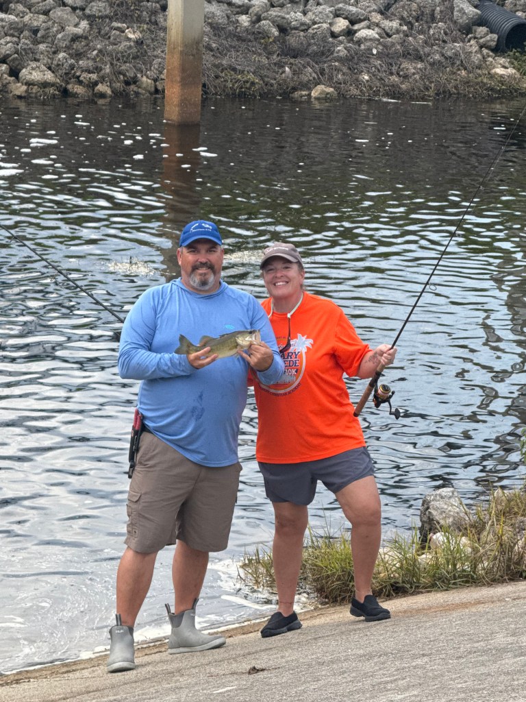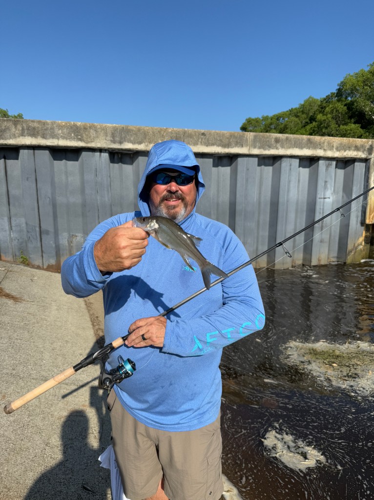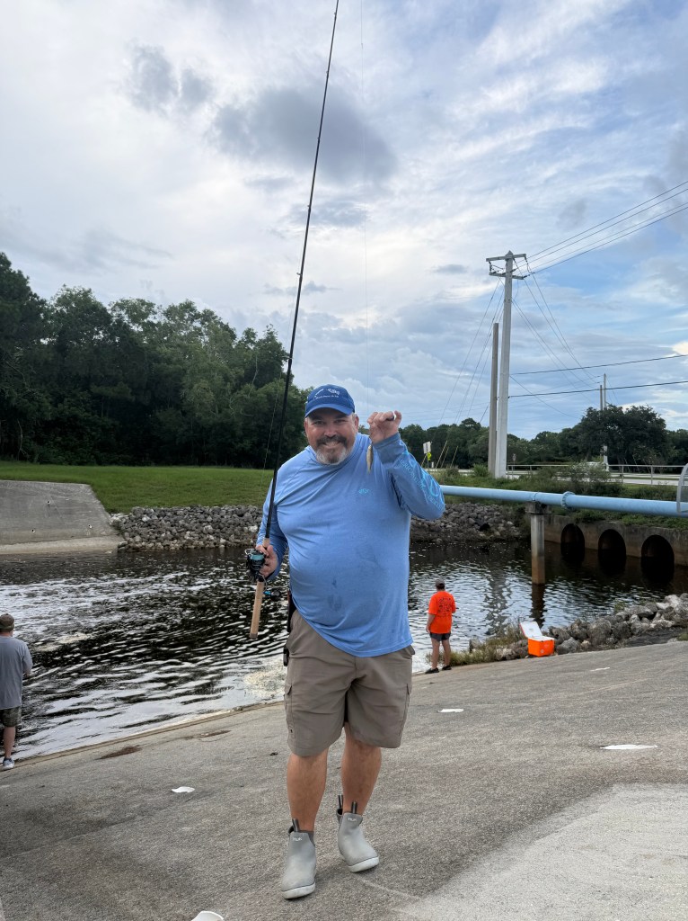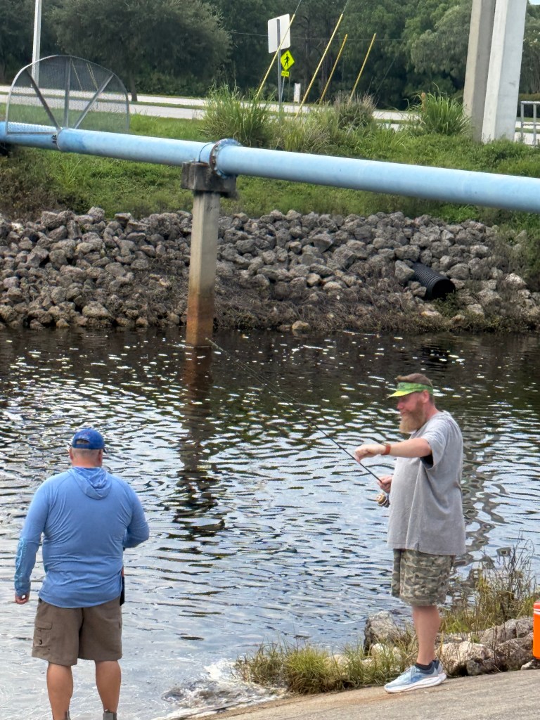 Saturday evening brought a break in the weather, so we made a quick run to Billy Bones Tackle, grabbed four dozen shiners, and headed to C-24 Canal. Despite our hopes, we didn’t get so much as a nibble. Not ready to give up, we packed up and headed to one of my favorite nearby spillways.