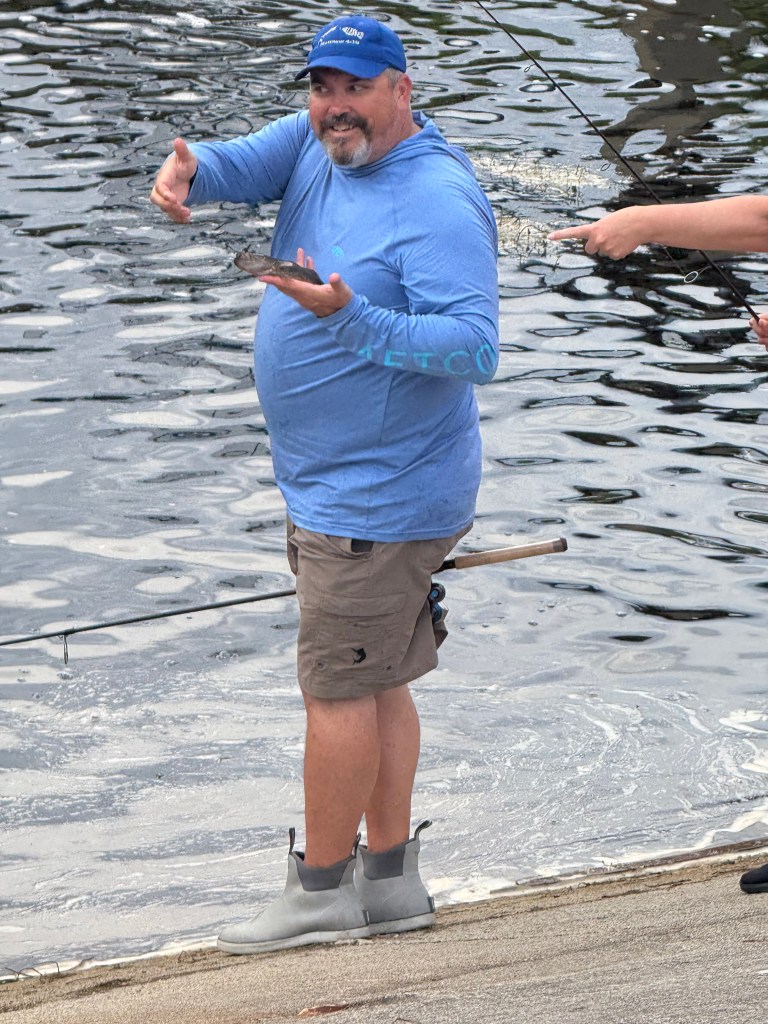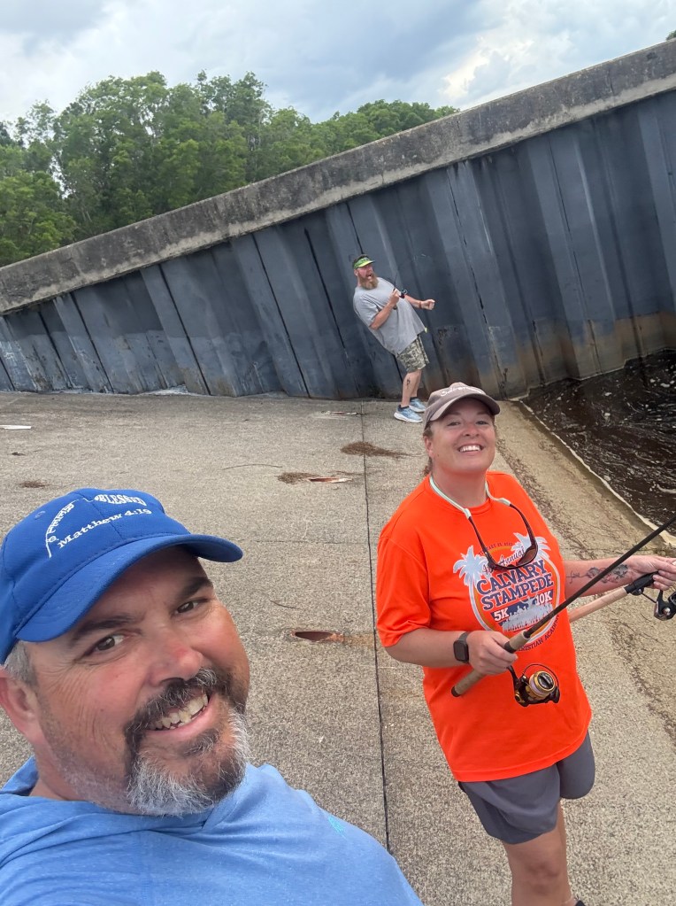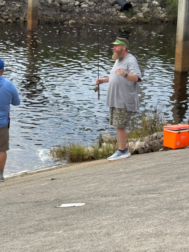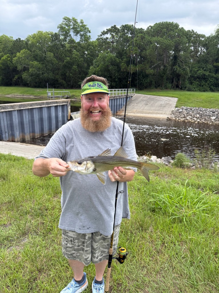 Saturday evening brought a break in the weather, so we made a quick run to Billy Bones Tackle, grabbed four dozen shiners, and headed to C-24 Canal. Despite our hopes, we didn’t get so much as a nibble. Not ready to give up, we packed up and headed to one of my favorite nearby spillways.