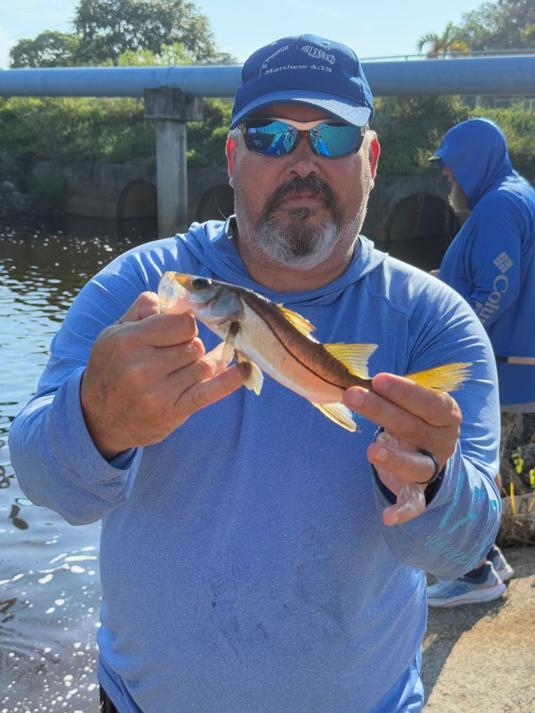 With bait still on hand, we returned to the same spillway Sunday morning around 8 a.m. Tania kicked things off with a swordspine snook just minutes into casting. We fished for about an hour before we ran out of bait, but in that time, Tania caught two swordspine snook, Darryl added another swordspine and battled a few elusive Florida gar, and I finally broke the skunk with a nice Mayan cichlid.