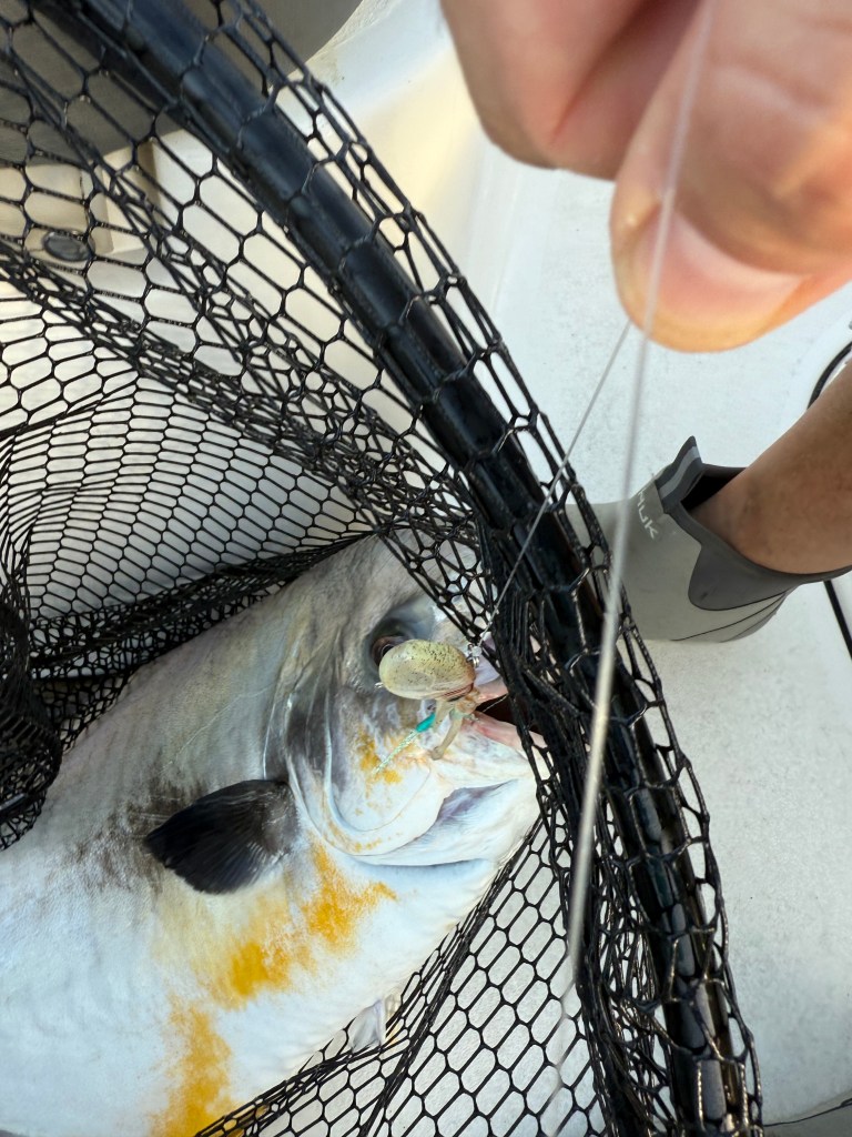 Not even a minute after dropping her line, Tania hooked into a serious fish that immediately started peeling drag. I reeled in to help her, and on the way up, I got smashed by a bluefish that couldn’t resist my jig, making me the first to land a fish that day, which is usually a curse for the boat, but Tania didn’t care as she had a real fight on her hands. After about ten minutes of working the fish, we finally saw color. It was a beautiful 15-pound permit. We couldn’t think of a better way to start the day.