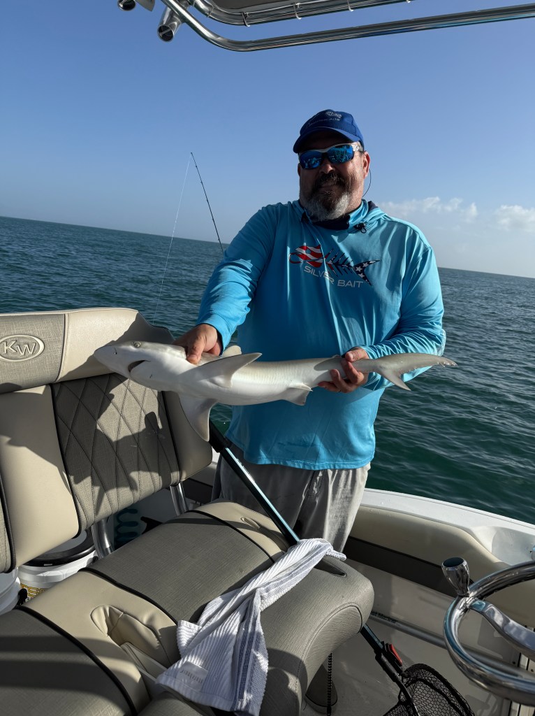 Unfortunately, the boils were slow. We stayed on the Boils for the next few hours, marking plenty of fish but struggling to get them to bite. Tania stuck with her trusty Squidtrex, and I rotated through a few of my favorite 40G jigs, but nothing seemed to light them up. Just before 10:00 a.m., I landed a small shark, which sparked the decision to give the buoy one last try before heading back towards the inlet.