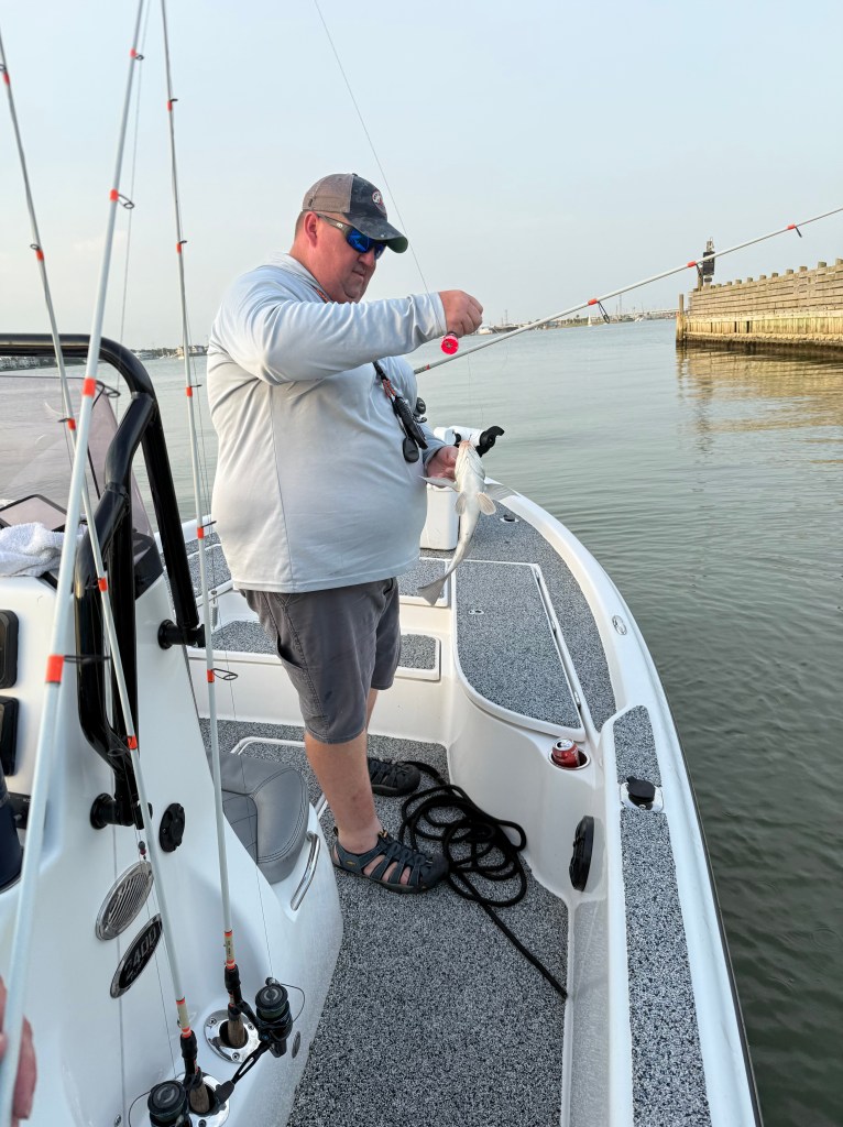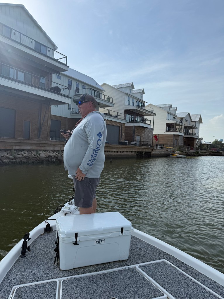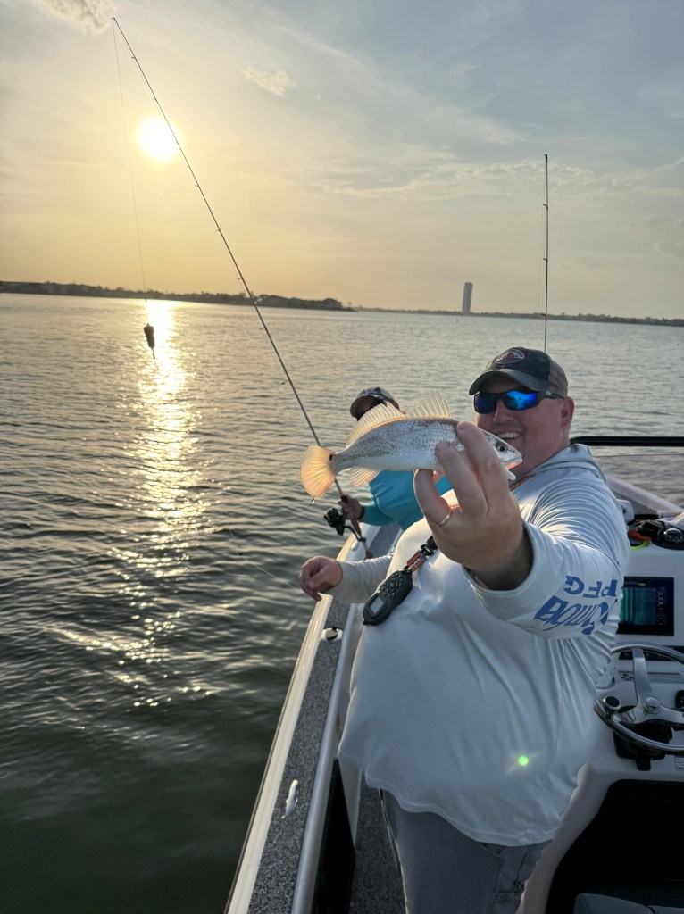 This week, Tania and I were in Texas for work training in Pasadena. While at ICAST, our friend Captain Derek of Spot Stalkers Charter offered to take Tania and me fishing, as we were close to Clear Lake. We met him on Wednesday at the Blue Marlin Fuel Dock around 5:00 p.m., ready for an evening of fishing and fellowship.