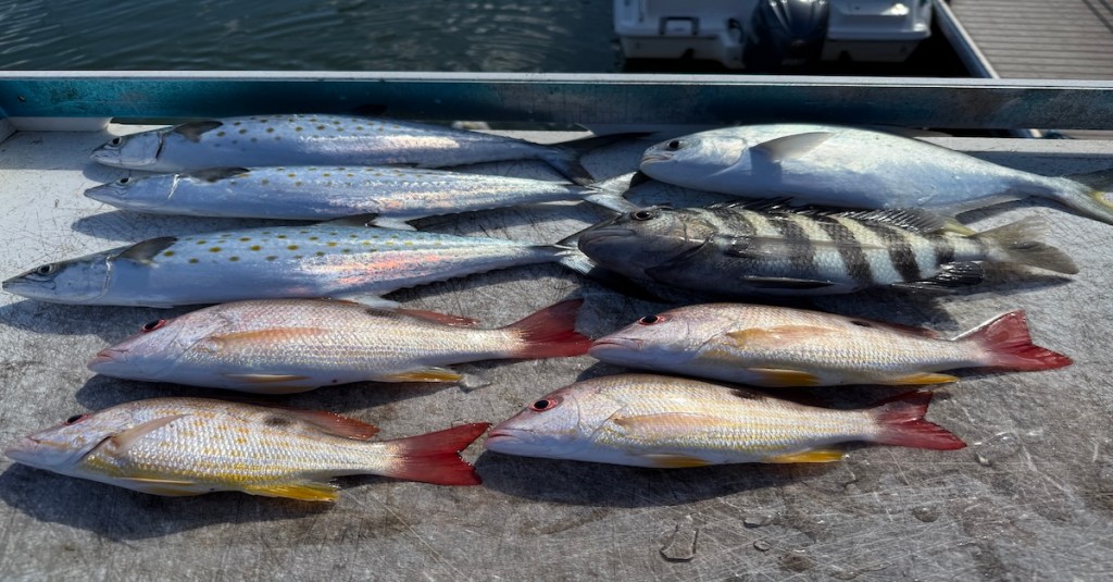 After catching a few Spanish mackerel and placing them in the cooler, we realized our target species were still missing, so we decided to head to one of our nearby reef spots where we usually find snapper and black margate.